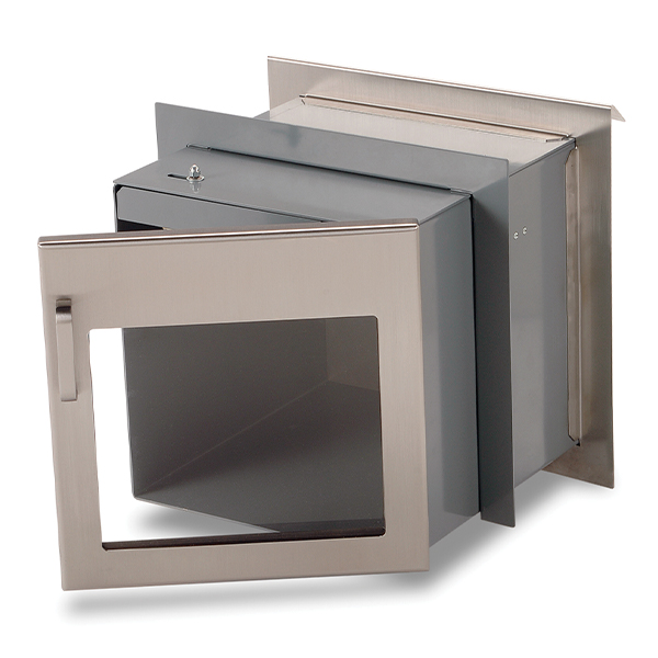 The stainless steel Package Pass has interconnected doors that operate like a sally port. One door must be closed before the other can be opened. Vision panel in rear door allows operator to view contents of the unit.